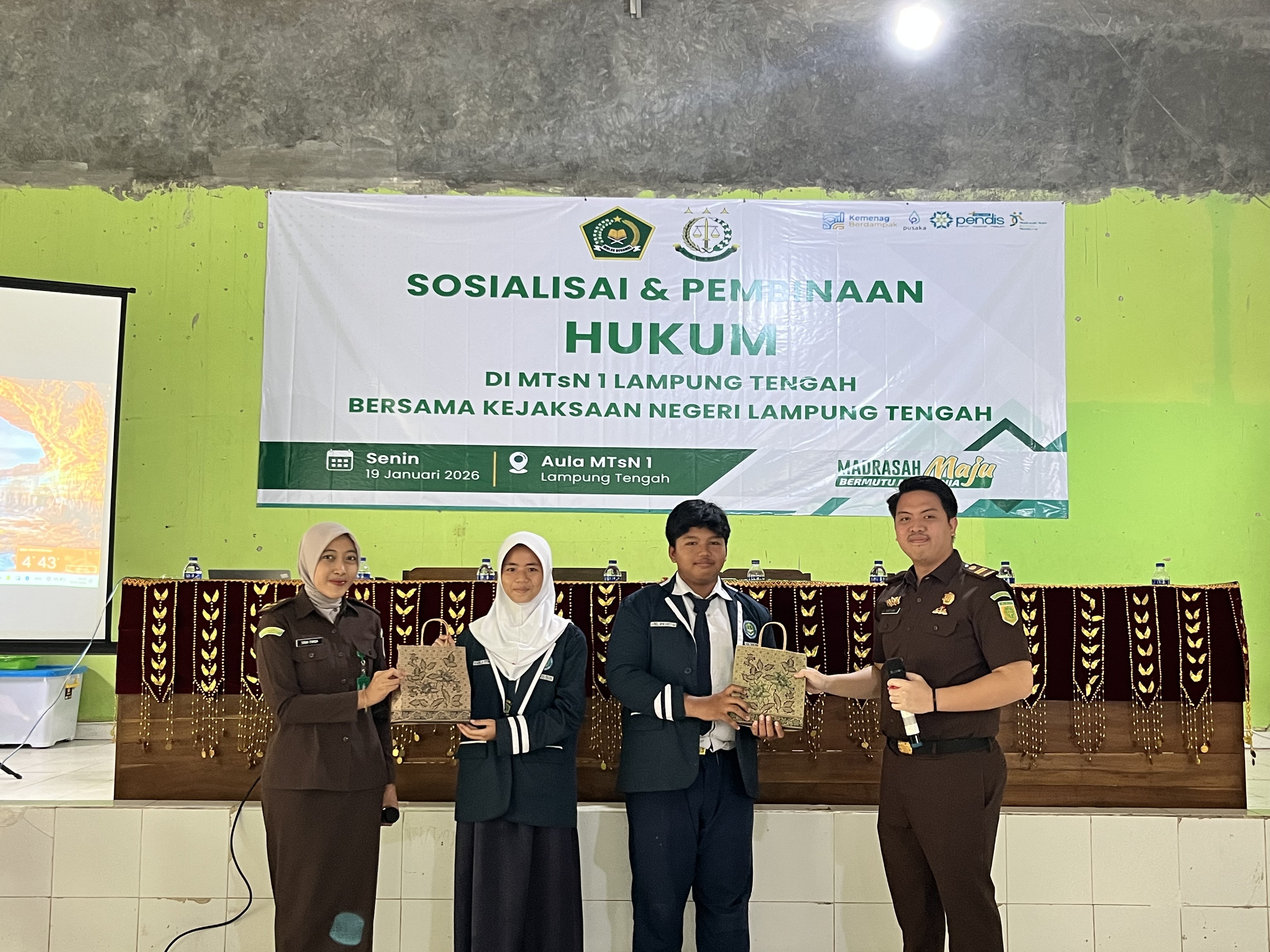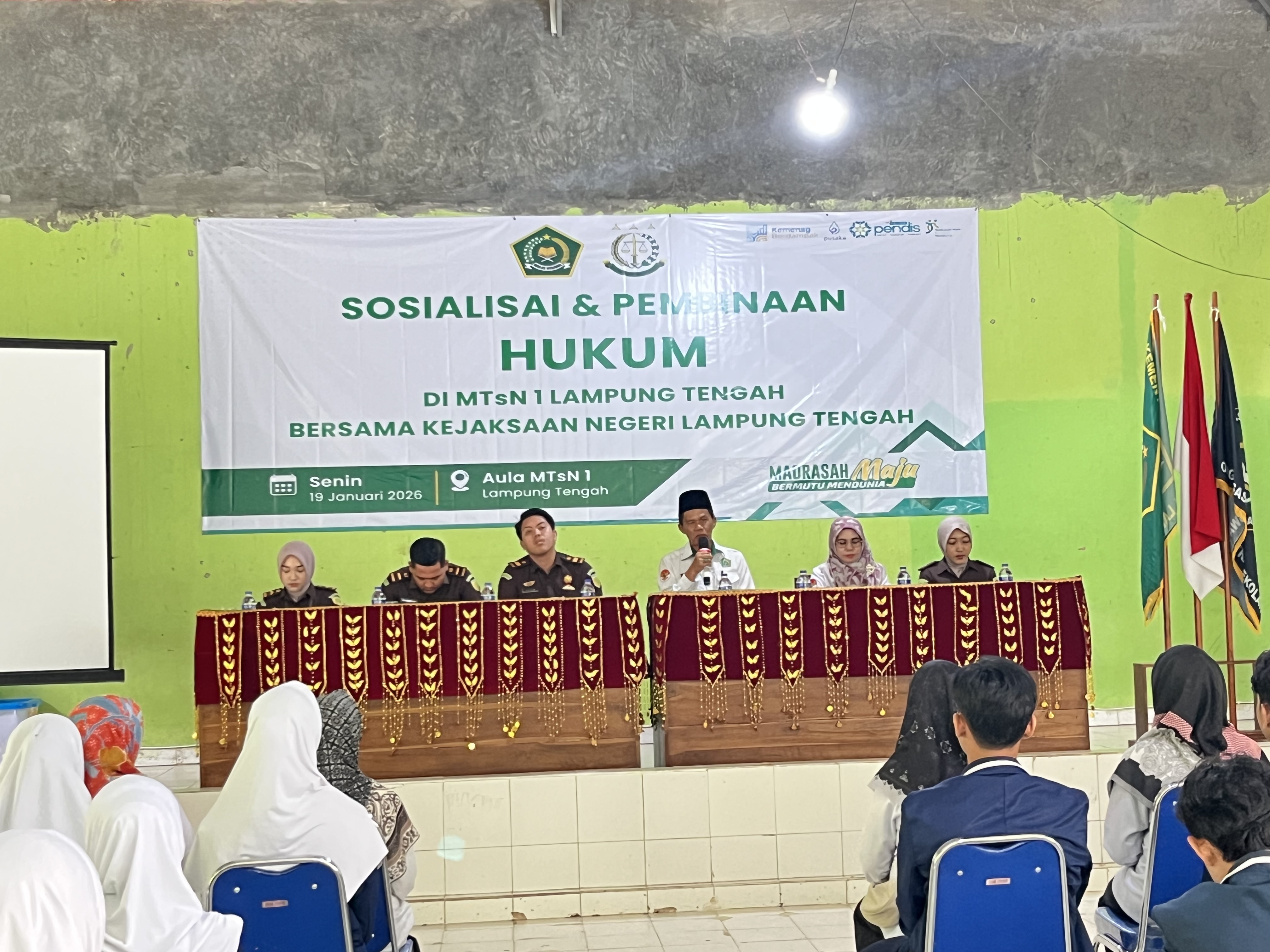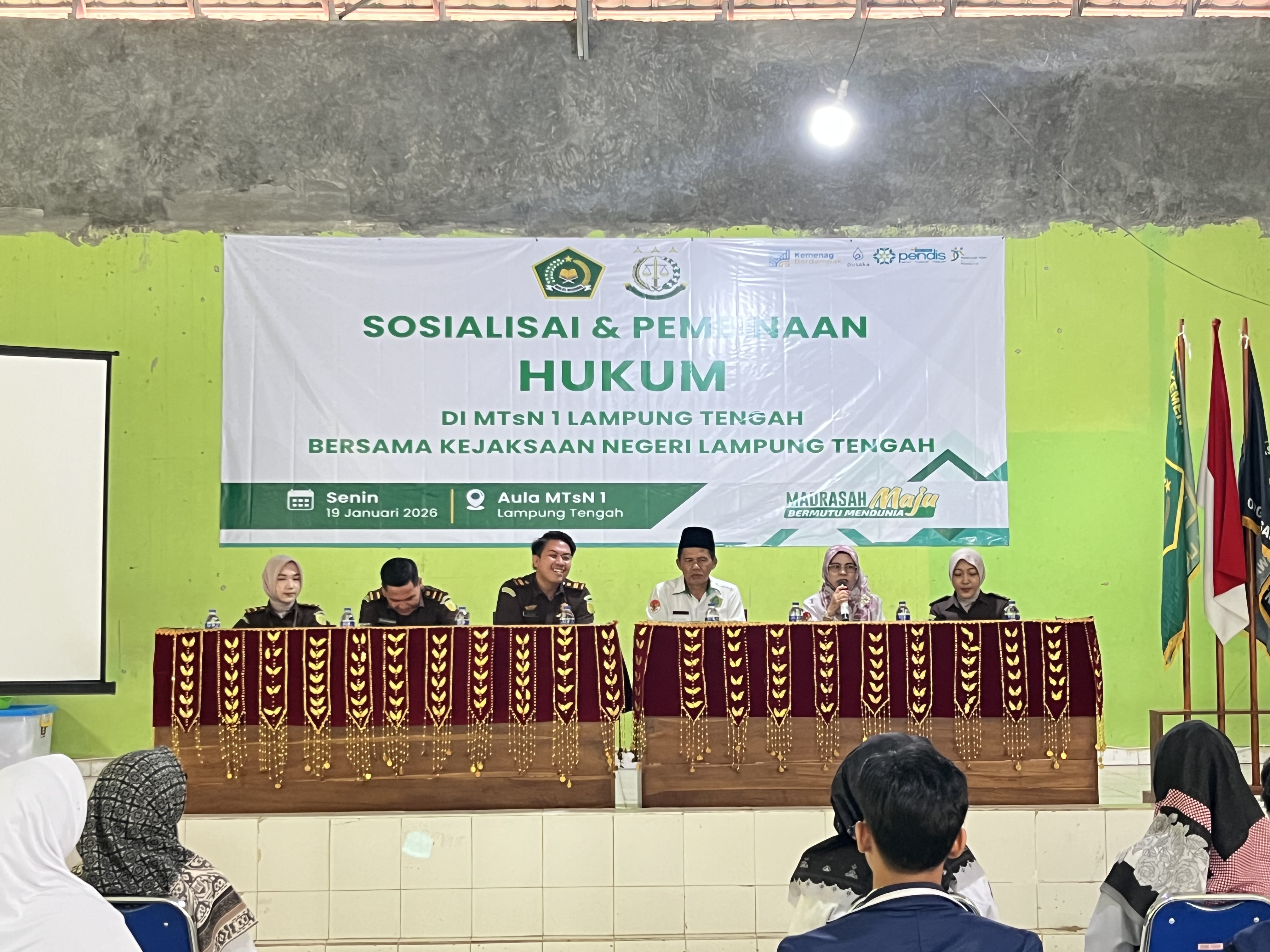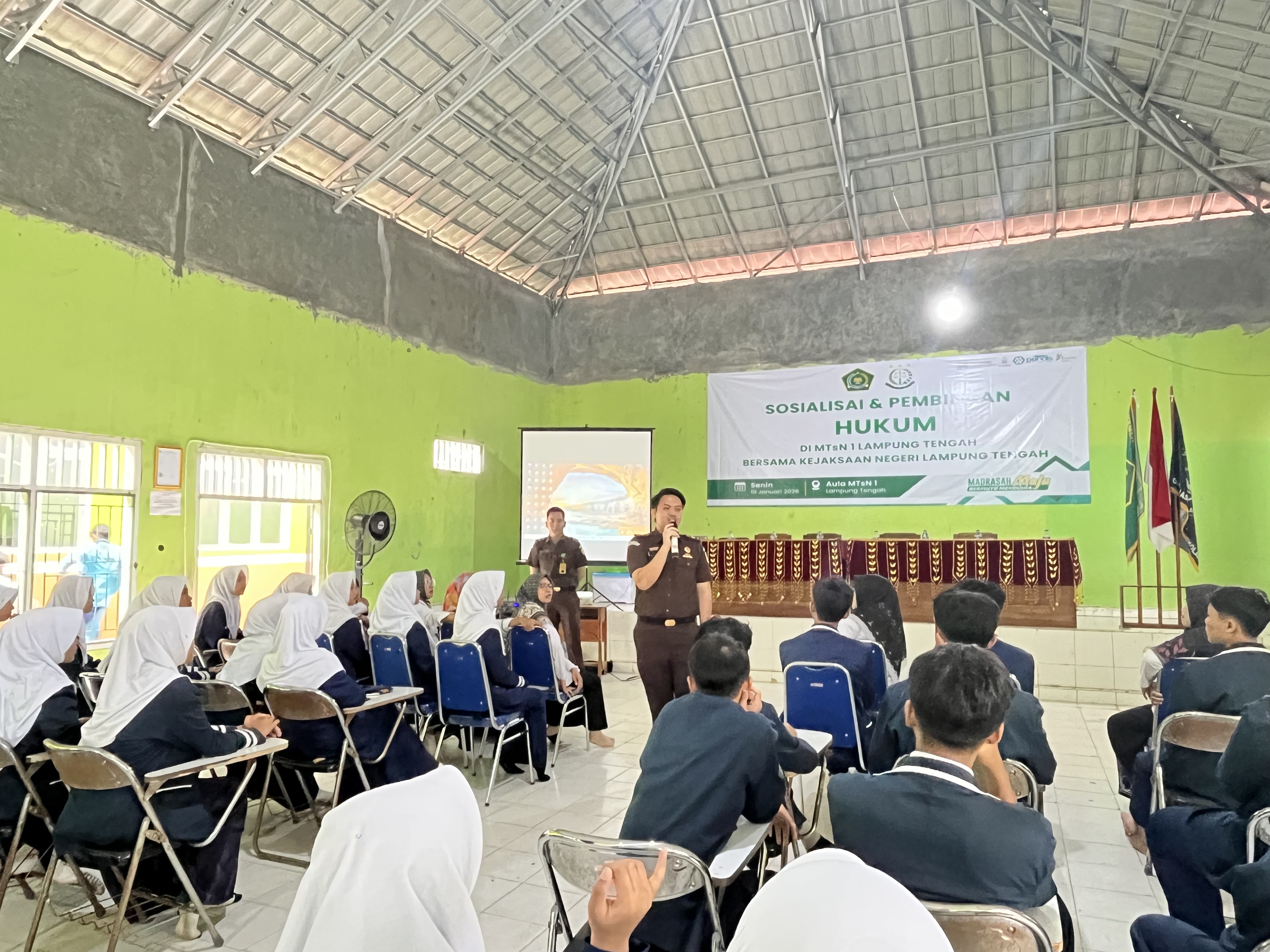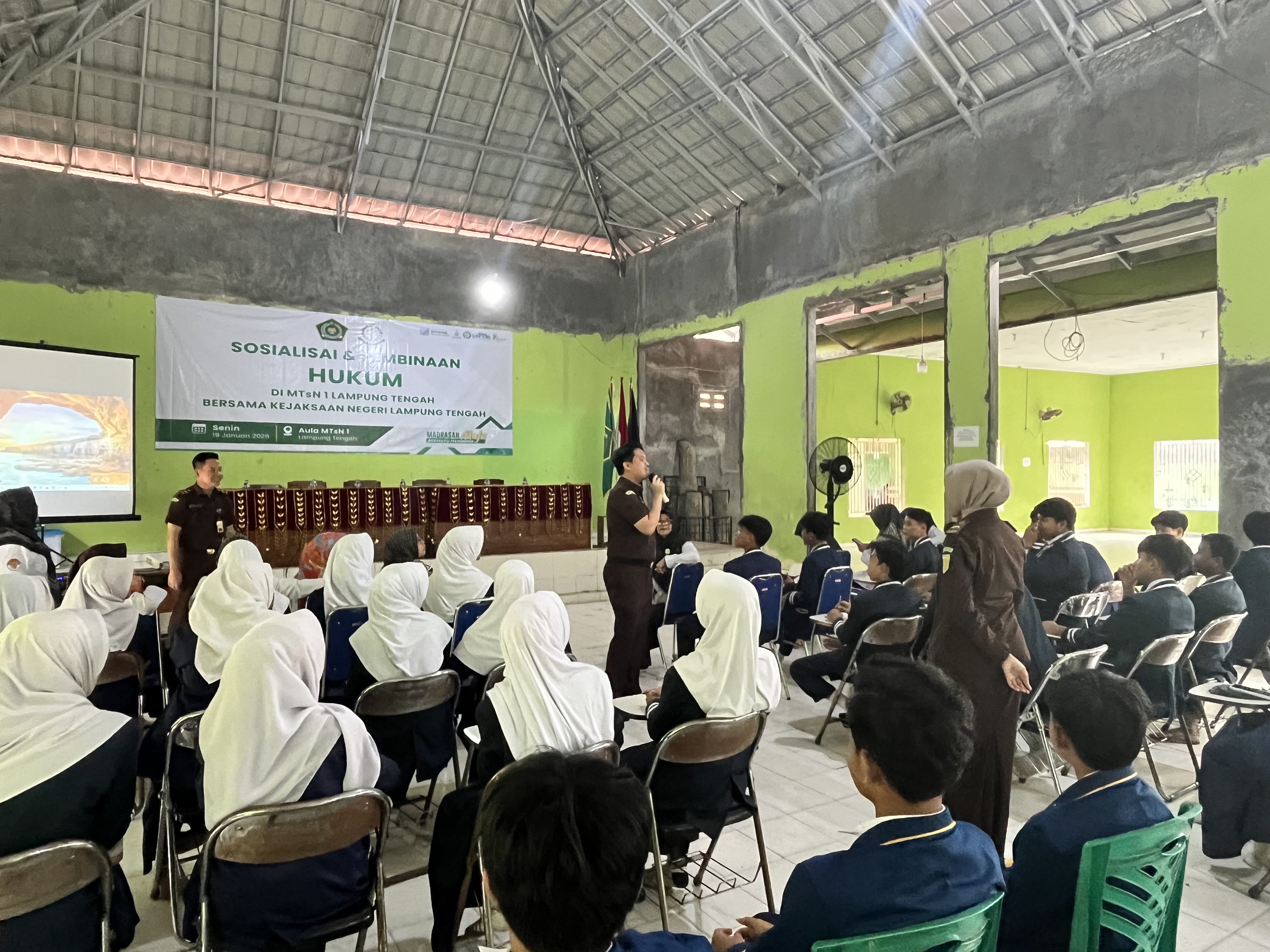 Terbanggi Besar, MTs Negeri 1 Lampung Tengah (Humas) - Dalam upaya membentuk peserta didik yang sadar hukum, berkarakter, dan bertanggung jawab, MTs Negeri 1 Lampung Tengah berkolaborasi bersama Kejaksaan Negeri Kab. Lampung Tengah melaksanakan kegiatan Sosialisasi dan Pembinaan Hukum bagi seluruh peserta didik pada Senin, 19/01/2026 yang bertempat di Aula Madrasah.
