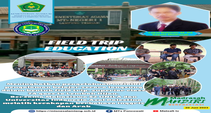 Kepala Madrasah MTs Negeri 1 Lampung Tengah, Bapak Lekat Rahman, M. Pd yang didampingi oleh Ibu Srilestari (Waka Kurikulum), Bapak Ardian Putra, S. Ag (Waka Kesiswaan) dan Bapak Pintoko Suproyogo (Pembina OSIS) mengajak Siswa/i untuk mengikuti kegiatan Field Trip Education di Taman Lembah Hijau Lampung, (20/06).