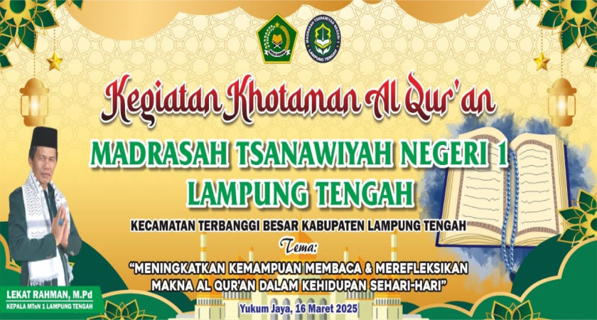 Yukum Jaya, MTsN 1 (Humas) - Dalam rangka meningkatkan kemampuan membaca dan merefleksikan makna Al Qur'an dalam kehidupan sehari-hari, MTsN 1 Lampung Tengah adakan kegiatan khotaman Al Qur'an. Bertempat di Aula MTsN 1 Lampung Tengah, kegiatan ini dilaksanakan pada Minggu, 16 Maret 2025 dan diikuti oleh Siswa/i unggulan kelas 7A, 8A dan 9A serta perwakilan setiap kelas yang ditunjuk langsung oleh pembimbing tahfidz.